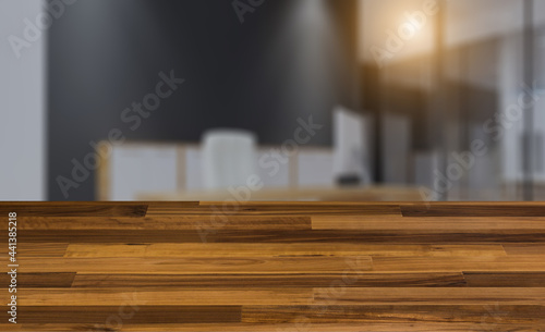 black-white design interior of a business center.. 3D rendering.. Abstract blur phototography. wooden table on blurred background.