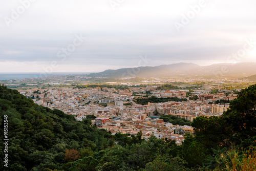 Blanes from the chapel Santa Barbara on the hill overlooking the city to the mediterranean sea. At sunset in summer, Catalonia, Spain