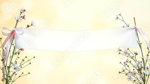 Blank Banner Decorated With Delicate White Flowers and Soft Pink Ribbons on a Creamy Background