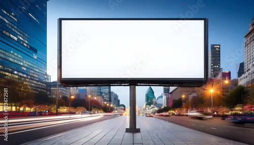 Blank billboard on city street at twilight, ideal for advertising, promotions, and marketing. Urban backdrop with lights and skyscrapers.
