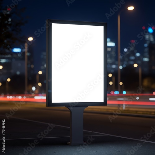 blank, billboard, advertisement, signage, signs, advertising, display, panel, lightbox, illuminated, night, city, street, road, urban, dark, background, template, empty, vertical, rectangular, modern, public, media, message, promotion, marketing, communication, graphic, design, commercial, space, bright