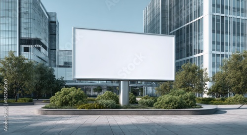 Blank billboard stands in a city street with modern buildings and green plants.
