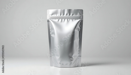 Blank foil plastic pouch coffee bag mockup, aluminium material, isolated on white background. Ideal for showcasing coffee or food product packaging designs. Clipping path included for easy customizati