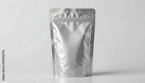 Blank foil plastic pouch coffee bag mockup, aluminium material, isolated on white background. Ideal for showcasing coffee or food product packaging designs. Clipping path included for easy customizati