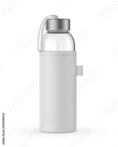Blank glass water bottle with blank bottle sleeve 3d render illustration.