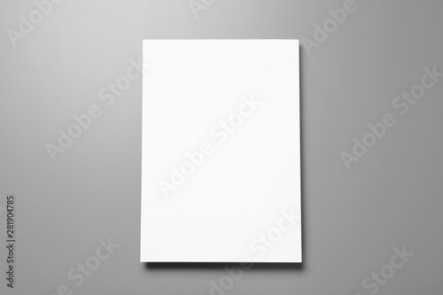Blank paper sheets for brochure on grey background, top view. Mock up