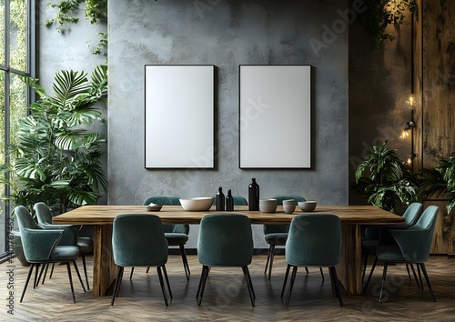 Blank posters on wall in clean minimalist dining space, perfect 3D rendering for product presentation, wall art previews, or interior scene mockups