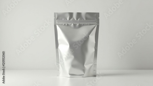 Blank Silver Foil Pouch Packaging Mockup for Product Presentation on White Surface
