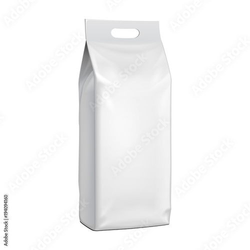 Blank Stand Up Pouch Snack Sachet Bag With Handle. Mock Up, Template. Illustration Isolated On White Background. Ready For Your Design. Product Packaging. Vector EPS10