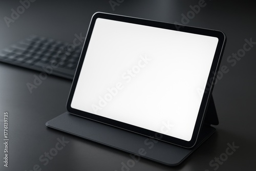 Blank Tablet on Desk with Keyboard Background for Technology and Business Concepts