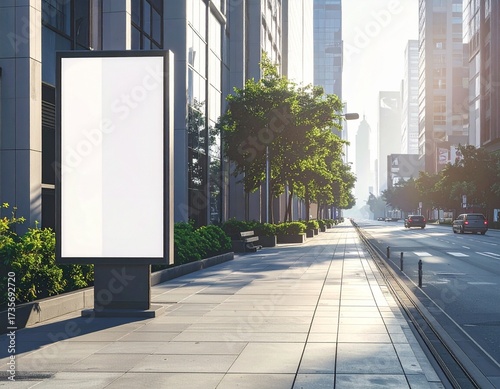Blank vertical billboard on urban sidewalk, surrounded by modern buildings, cinematic lighting.