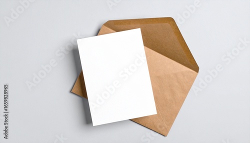 Blank White Card in Kraft Paper Envelope on Gray Background