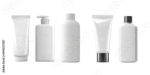 Blank white cosmetic packaging set including bottles, tubes and dispenser, ready for mockup