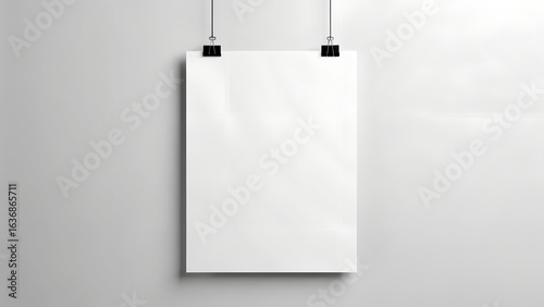 blank, white, paper, hanging, wall, empty, poster, document, sheet, background, clean, minimal, modern, simple, copy, space, template, display, vertical, clipping, binder, clip, attachment, information, announcement, notice, message, creative, design