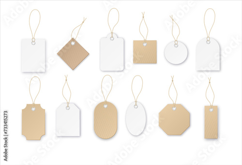 Blank white paper price tags or gift tags in different shapes. Set of labels. Vector