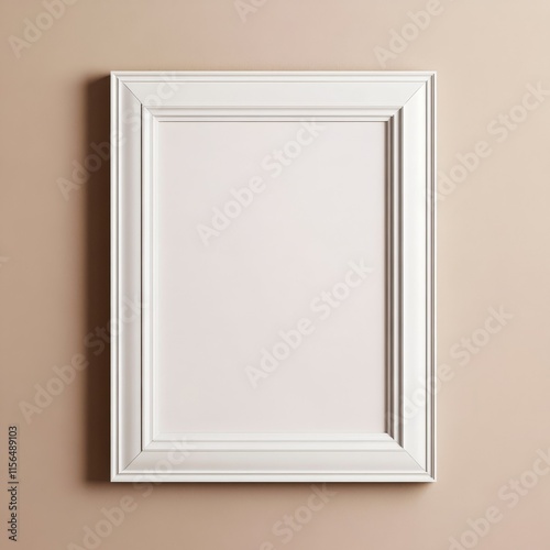 Blank white picture frame on a plain beige background. Empty poster mockup for art display. No people.