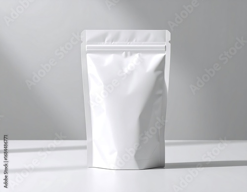 pouch, white, blank, cardboard box, food, product, design, empty, aluminium, zip, plastic, standing, light, shadow, studio, three-dimensional, render, modern, clean, simple, bright, illustrative, realistic, template, graphic