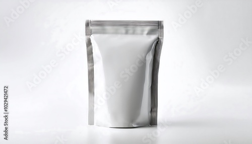 Blank white sachet packet standing upright on a soft-shadowed white background for packaging mockups or designs. Generative AI