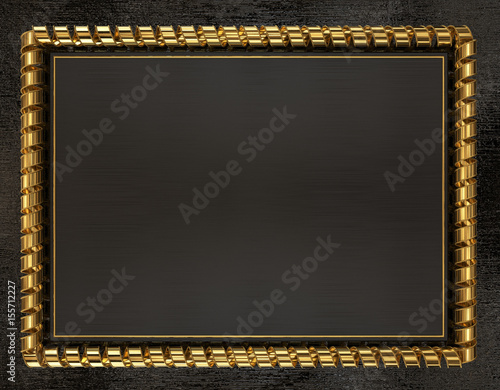 Blank wooden frame and border trimmed with gold ribbon. 3d illustration