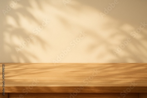 Blank wooden table against a beige wall with soft plant shadows. Ideal for product mockups, food photography backdrops, and showcasing designs with a natural, minimalist aesthetic.
