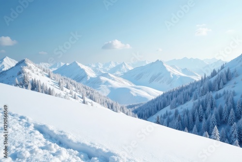 Blanketing white snow covering rolling hills, pristine scene , hills, tranquil, snow