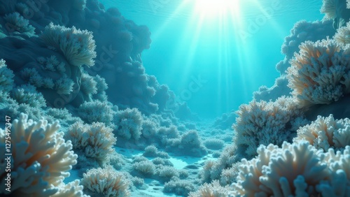 Bleached coral reef underwater with sunlight rays illuminating the seabed