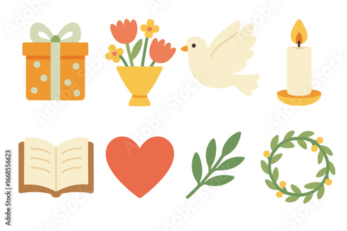 blessing, gift, icon, grid, flat, vector, mini, illustration, colours, children, wrapped, present, flower, bouquet, dove, candle, book, nubes, olive, tree branch, chaplet, design, designed, all, icon