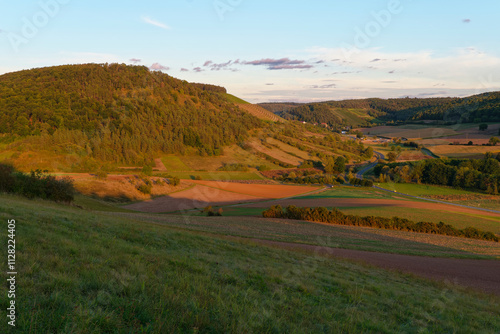 Blick auf das Weindorf Ramsthal und seine Weinberge im Abendlicht, Landkreis Bad Kissingen, Franken, Unterfranken, Bayern, Deutschland