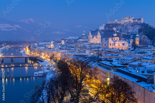 Blick auf Salzburg Stadt im Winter - Abendstimmung