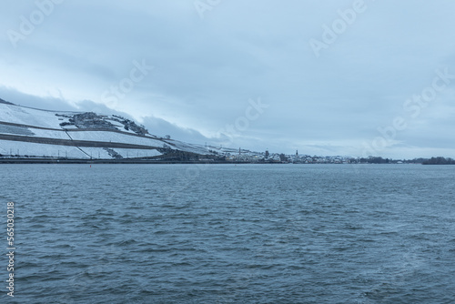 water, countryside, heaven, nature, mountain, flux, cloudy, winter, snow, snowy, hillside, hillside, vinery, rhine, shipping, body of water, nigh, rhineland-palatinate, cold, glacé, tour tourism, tourist attraction