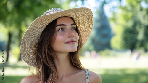 Blissful Woman Relaxing in a Vibrant Summer Hat at the Park