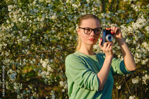 Blond girl in glasses is photographing flowering trees with her film soviet camera in May.