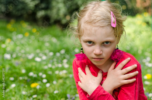 girl, children, children, blond, hair, long, beautiful, adorable, grass, dramatic, view, look, crossed, hand, meadow, flower, springtime, outside, green, red, caucasian, childhood, park, summer, vital