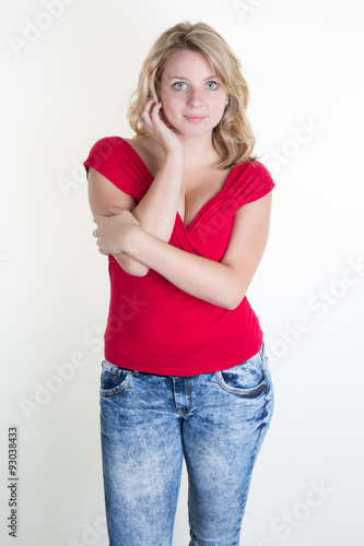Blond young and pretty girl with a red top