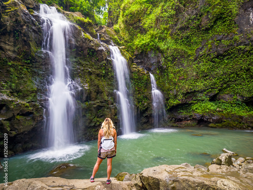 Blonde girl admires Three Bears Falls in Maui, Hawaii Hana Highway - Upper Waikani Falls. Road to Hana connects Kahului to the town of Hana Over 59 bridges, 620 curves, tropical rainforest.