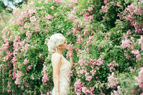 Blonde girl near rose bush