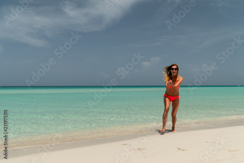 beach, sea, woman, ocean, summer, sand, water, young, tropical, vacation, coast, walking, sky, holiday, people, boy, travel, beautiful, person, nature, blue, 1, leisure, children, bikini, girl, blond, cuba, caribbean, fun, vacation, long hair, sunglasses