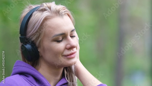 Blonde in purple sweatshirt listening to music on headphones while breathing fresh air in forest
