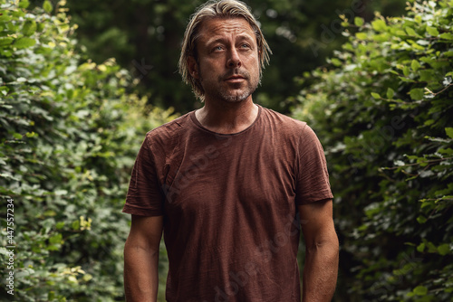backpack, masculine, outside, hike, walk, leisure, vacation, trip, coiffure, leaf, foliage, tree, countryside, nature, summer, t-shirt, eye, blue, middle-aged, rugged, tanned, black, brown, stubble field, blond, blond, outdoors, estate, hedge, adult, active, activity, park, green, healthy, caucasian, casual attire, confident, alone, photogenic, lifestyle, guy, male, person, attractive, man, face, portrait