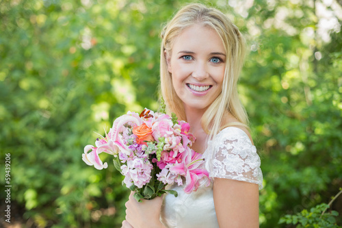 20s, young adult, woman, female, caucasian, outdoors, fair hair, blond, light hair, coiffure, pretty, attractive, charming, beauty, beautiful, glamour, gorgeous, bride, bridal, lace, white, bridal gown, bridal gown, marriage, wedding, gown, posing, happiness, natural, calm, peaceful, content, park, countryside, nature, green, sunshine, sunny, bouquet, flower, happy, smiling, cheerful, portrait