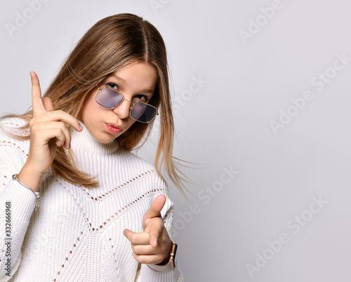 blond, teenage, girl, long, hair, blue, sunglasses, smart, watch, sweater, bracelet, pointing, indexed, standing, posing, isolated, white, studio, background, fashion, beauty, advertising, sincere, emotion, copy, space, closeup, people, teenage, female, schoolgirl, student, university, education, model, earring, jewellery, make-up, look, lifestyle, happy, pure, skin, outfit, trendy, slim, casual attire, naughty, modern, 1