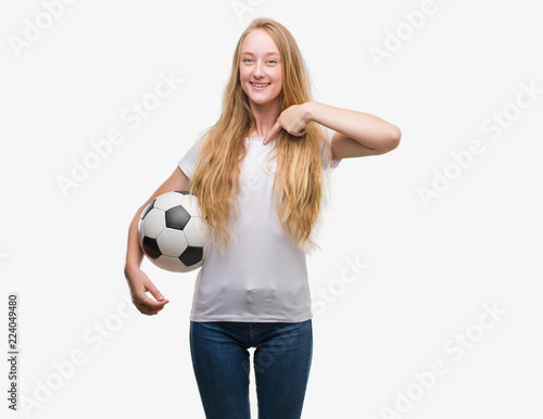 Blonde teenager woman holding soccer football ball with surprise face pointing finger to himself