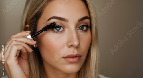 Blonde woman applying black mascara to eyelashes with precision wand. Eye makeup routine and lash enhancement for volume treatments and beauty salon procedures