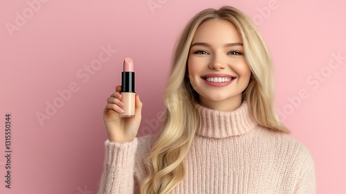 lipstick, woman, blond, pink, background, beauty, make-up, cosmetic, model, smile, happy, pretty, gorgeous, attractive, face, hair, long, fashion, style, product, holder, hand, showing, display, girl, portrait, studio, shot, image, photo, advertising, promotion, marketing, sale, offer, care, skin, lip, gloss, colours, shade, texture, application, elegant, glamour