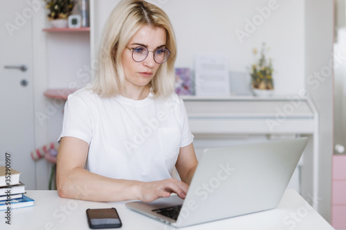 quarantine, epidemic, infection, outbreak, virus, pandemic, attractive, laptop, woman, home, working, smiling, business, computer, table, people, sitting, businesswoman, communication, cyberspace, person, female, office, technology, modern, beautiful, girl, work, manager, online, blond, lady, successful, smart, caucasian, desk, freelancer, indoor, web, 1, lifestyle, white