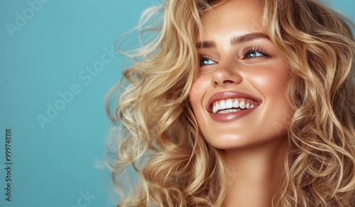 woman, blond, hair, smile, teeth, happy, cheerful, beauty, model, portrait, face, eye, blue, skin, healthy, bright, expression, emotion, studio, isolated, background, blue background, curly hair, blonde hair, wavy hair, natural beauty, cosmetic, make-up, skincare, fresh, closeup, head shot, attractive, glamour, beautiful, girl, confident, feminine, lifestyle, style, pretty, fashion, young, adult, natural, happy woman