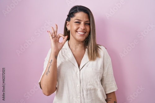 background, blond, doing, expression, finger, hand, ok, pink, positive, signs, smiling, standing, successful, woman, adult, agree, approve, casual attire, cheerful, confident, face, female, finger, friendly, fun, gesture, good, great, happiness, hispanic, latin, looking, natural, ok, people, person, portrait, showing, smile, studio, success, yes, young