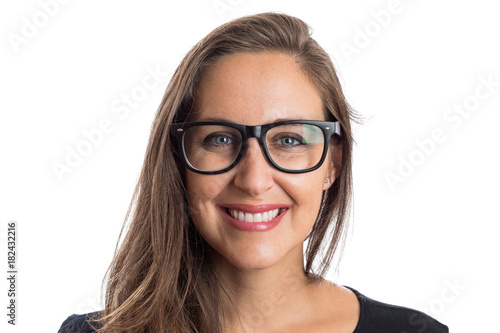 Blonde woman with glasses with a beautiful smile blue eyes and glasses on white background