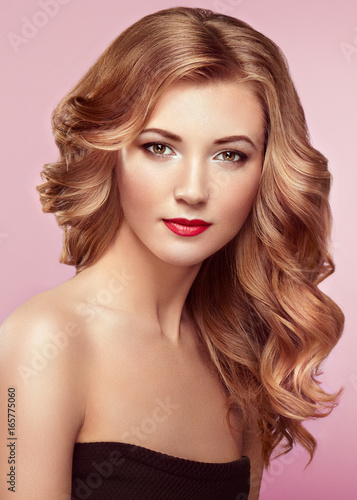 Blonde woman with long and volume shiny wavy hair . Beautiful model with curly hairstyle. Perfect make-up. Beauty style model