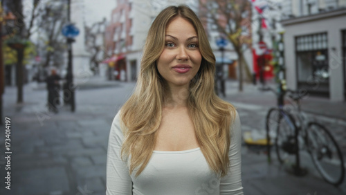 woman, finger, point, street, blond, female, white, top, outdoors, britain, playfulness, invitation, bike, lamp-post, tree, sidewalk, pavement, building, shop, window, signs, road, pointing, portrait, frame, model, video, outfit, apparel, fashion, photo, camera, hair, long, casual attire, clothing, smile, wink, hand, gesture, eye, lip, eyelash, eyebrow, skin, complexion, cheek, chest, torso